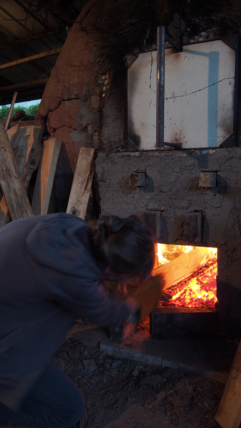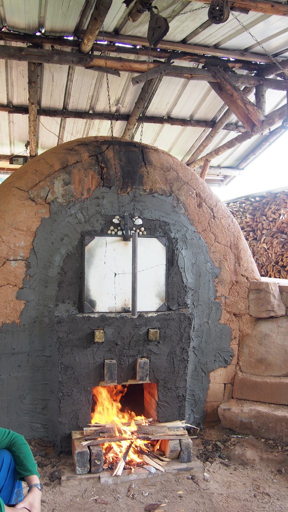 Je ne suis pas très douée en chimie, j’ai donc quelques difficultés à bien vous expliquer ces fonctionnements, mais vous avez l’idée générale du processus. A ce moment de la cuisson, la chaleur autour du four était insupportable et je ne vous raconte pas au moment de mettre du bois à l’intérieur. C’était très impressionnant. Je n’ai jamais senti une telle chaleur… En même temps, glisser du bois dans une fournaise à 1300°C, ça ne se fait pas tous les jours !