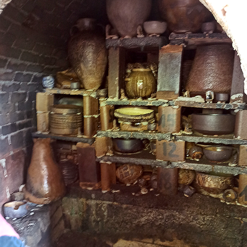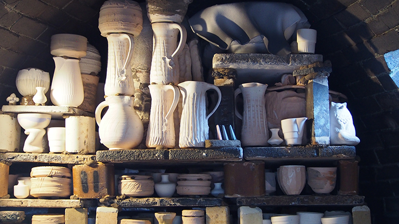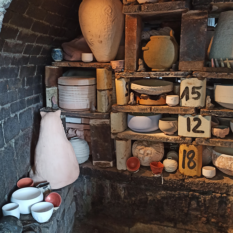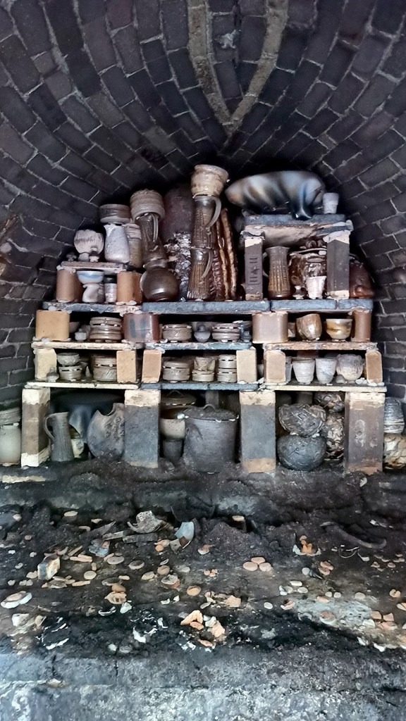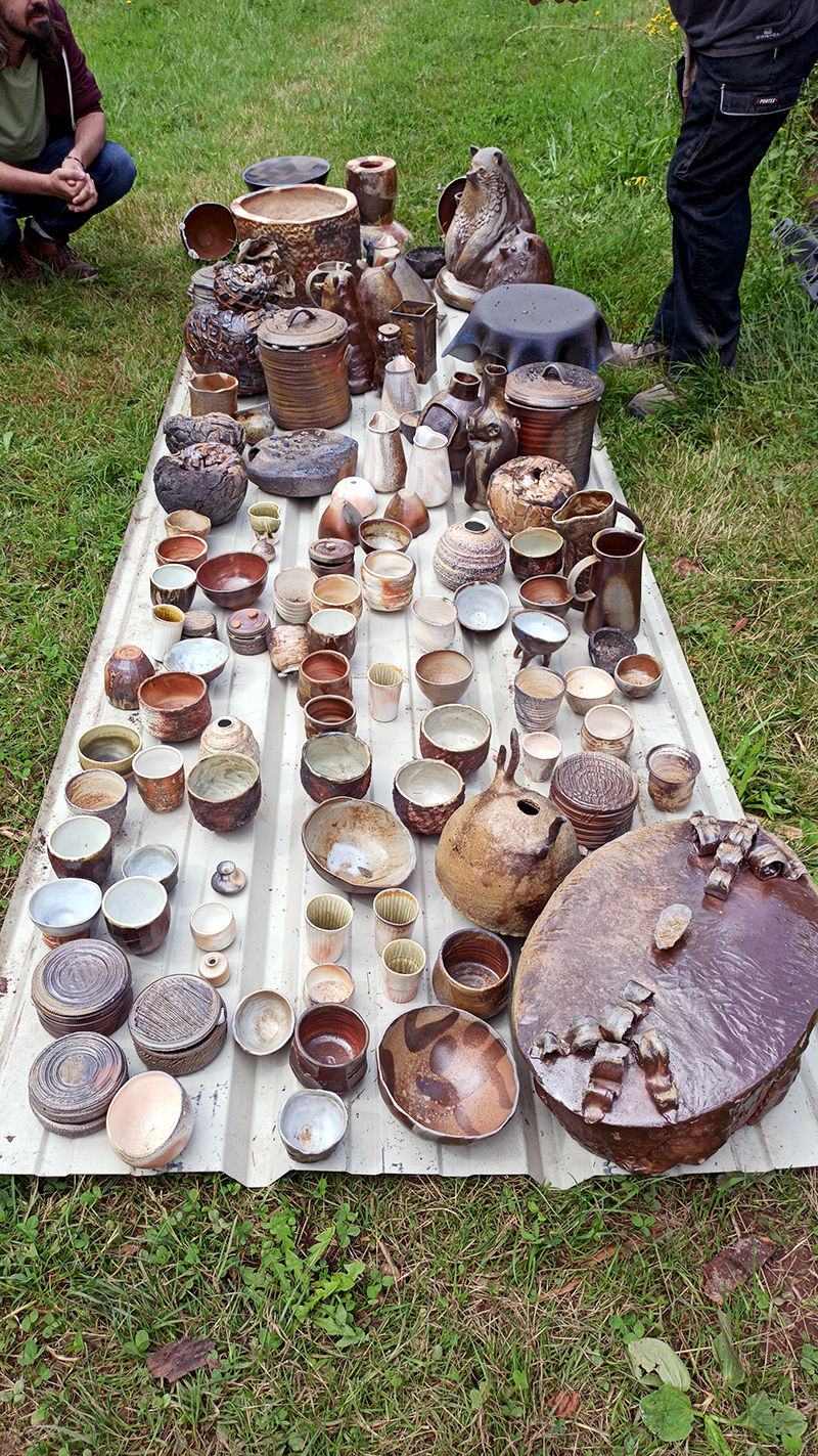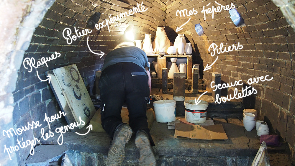 Le chargement du four a pris 2 jours à deux céramistes expérimentés. C’est une étape très délicate car il faut optimiser la place dans le four mais également d’anticiper les passages de flammes afin que les cendres se répartissent bien sur les pièces et permettent un bon tirage.