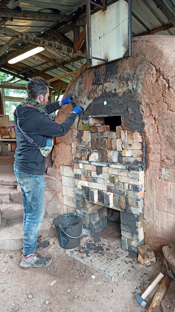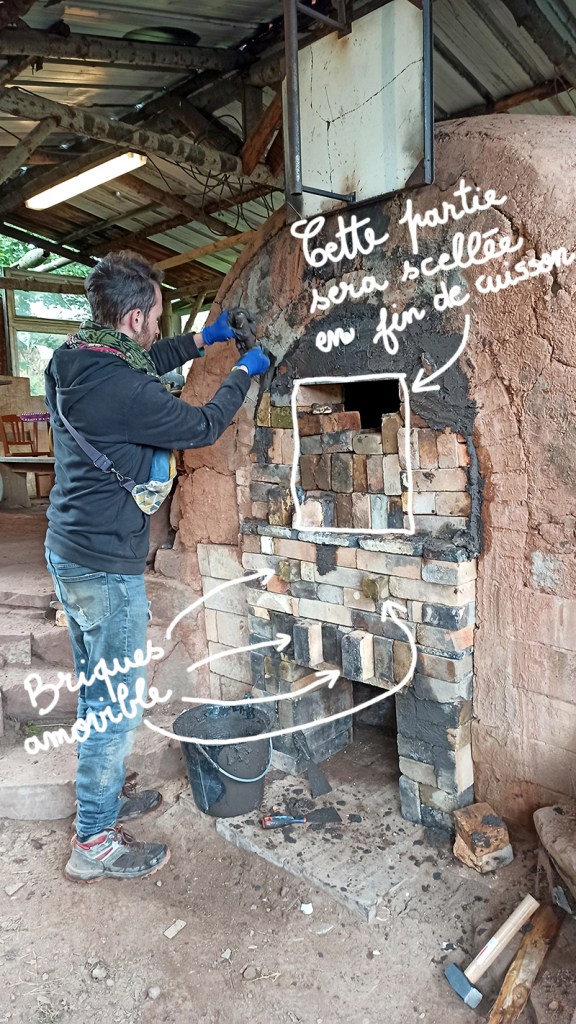 Ci-dessous, vous voyez que nous avons préparé les briques de la partie centrale qui viendront sceller le four à la fin de la cuisson. Elles ont été enlevées pendant la cuisson mais nous avions besoin qu’elles soient prêtes à l’emploi le moment venu. En effet, le four est à 1300°C au moment de son scellement final, il faut faire vite et attention.