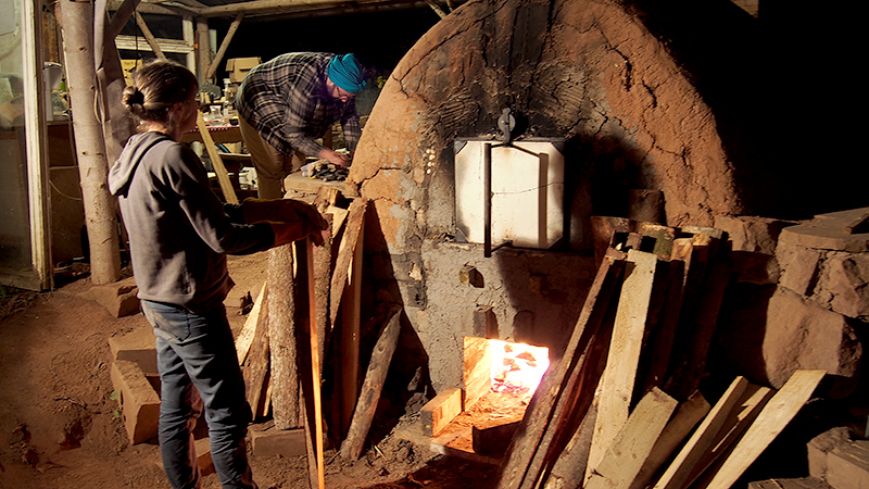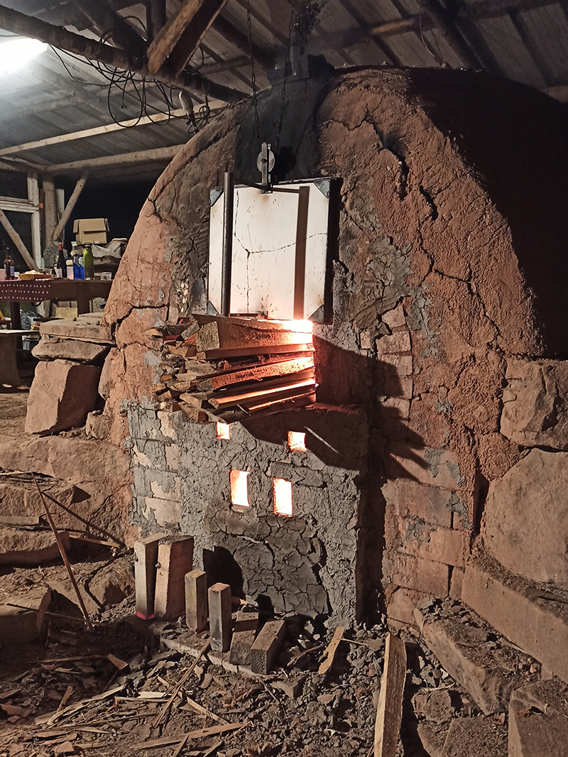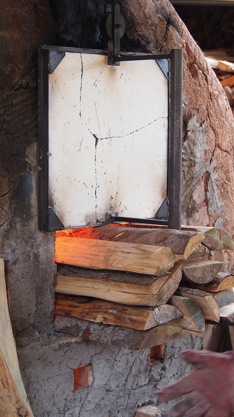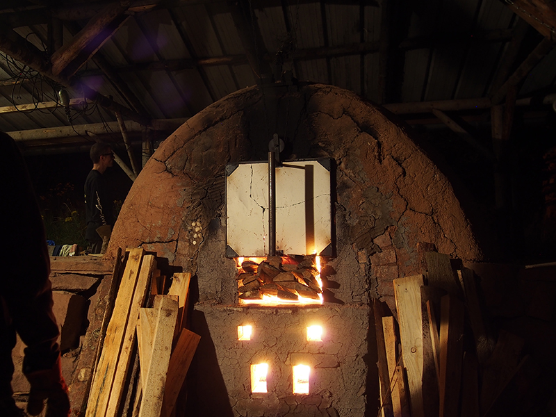 Je dormais quand la porte du four a été fermée en bas et que le chargement a commencé par le haut. Le but du chargement du bois en bas était de créer une grande quantité de braises et de cendres. Une fois que le niveau maximum était atteint, la partie basse de la porte a été fermée et le chargement du bois s’est fait par le dessus. A ce moment-là, le but était de monter à 1350°C puis de maintenir la température à 1300°C le plus longtemps possible (pour nous deux jours).